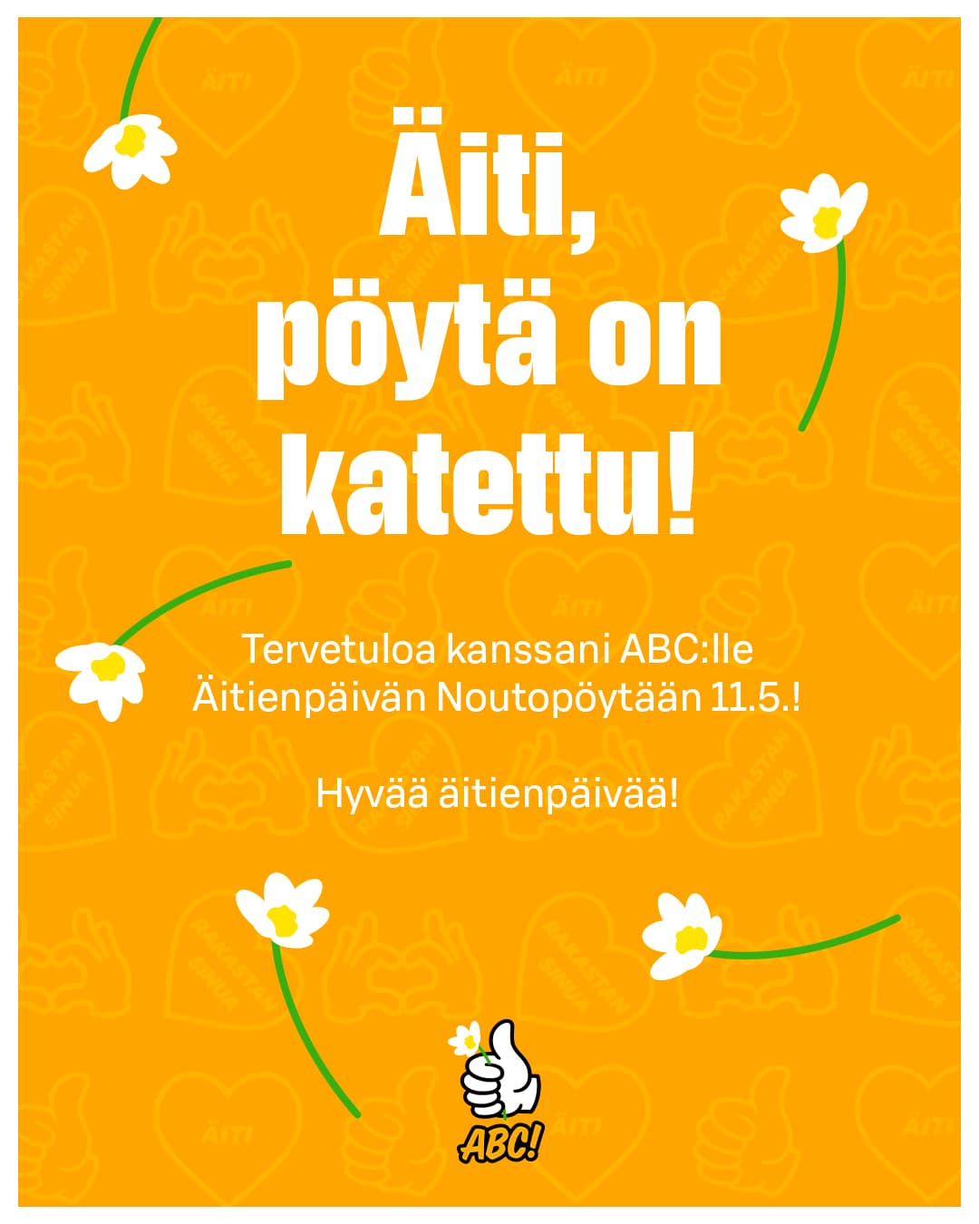 ÄITIENPÄIVÄN NOUTOPÖYTÄ on tarjolla sunnuntaina 11.5.2025 S-Etukortilla hintaan 18,90 € (ilman korttia 20,90 €). Hinta ABC Buffetmaailmassa S-Etukortilla 20,90 €, norm. 22,90 € (ABC Tiiriö, ABC Renkomäki, ABC Heinola, ABC Riihimäki, ABC Hirvaskangas). ABC Kolmenkulmassa ja ABC Akaa Toijalassa tarjolla Pizza & Buffan juhlabuffa S-Etukortilla 20,30€ norm. 22,30€.