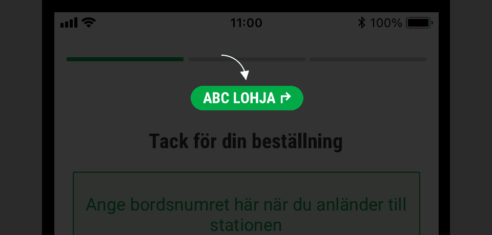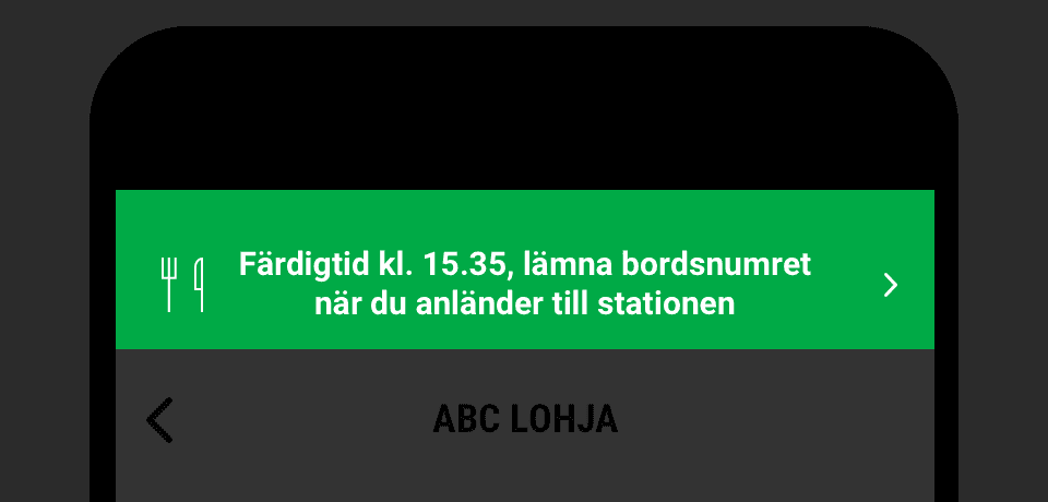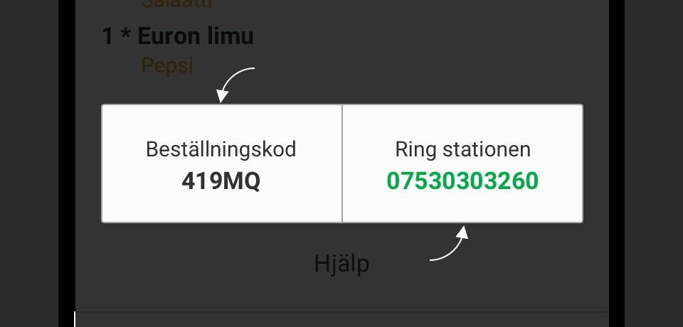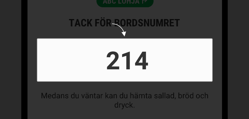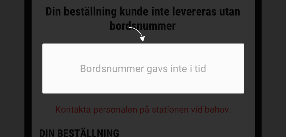 Utan bordsnummer kan inte beställningen levereras. Bordsnumret måste anges inom 10 minuter från det att maten är färdig.