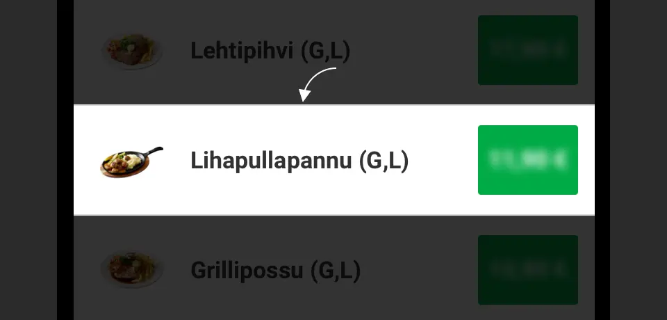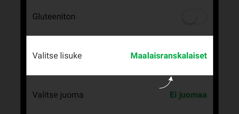Paina lisukkeen nimeä ja valitse minkä lisukkeen haluat. Valinnan jälkeen paina “Valmis”.